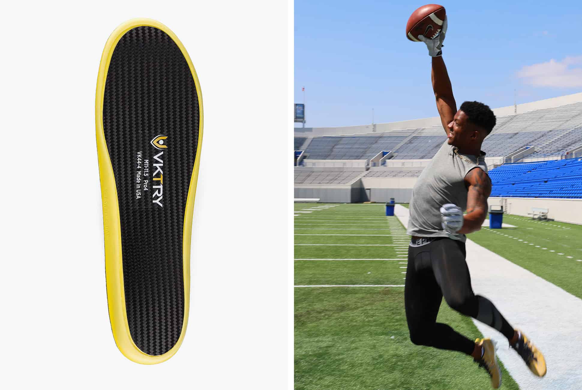 Proven to increase explosiveness by over 9 percent on average, increase vertical by an average of 1.6 inches and decrease 40-yard dash time by .12 seconds, VKTRY Performance Insoles are made from aerospace-grade carbon fiber in a patented curved shape to return the energy an athlete generates. This comes back in the form of increased power, speed and agility. They also provide added support, stability and shock absorption to protect against lower body injuries. There’s a reason why 44 NFL, NBA and MLB teams and over 100 NCAA teams wear VKTRY Performance Insoles: they can offer an explosive edge.