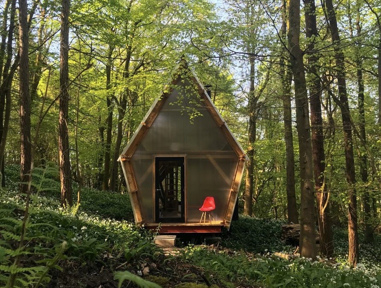 The interior makes effective use of timber, has scavenged insulation and is lined with shuttering ply, including the 2 staircases; handrails are constructed from offcuts of blue rope, and natural light gets through via gable ends which are ‘glazed’ with high-performance interlocking polycarbonate.
