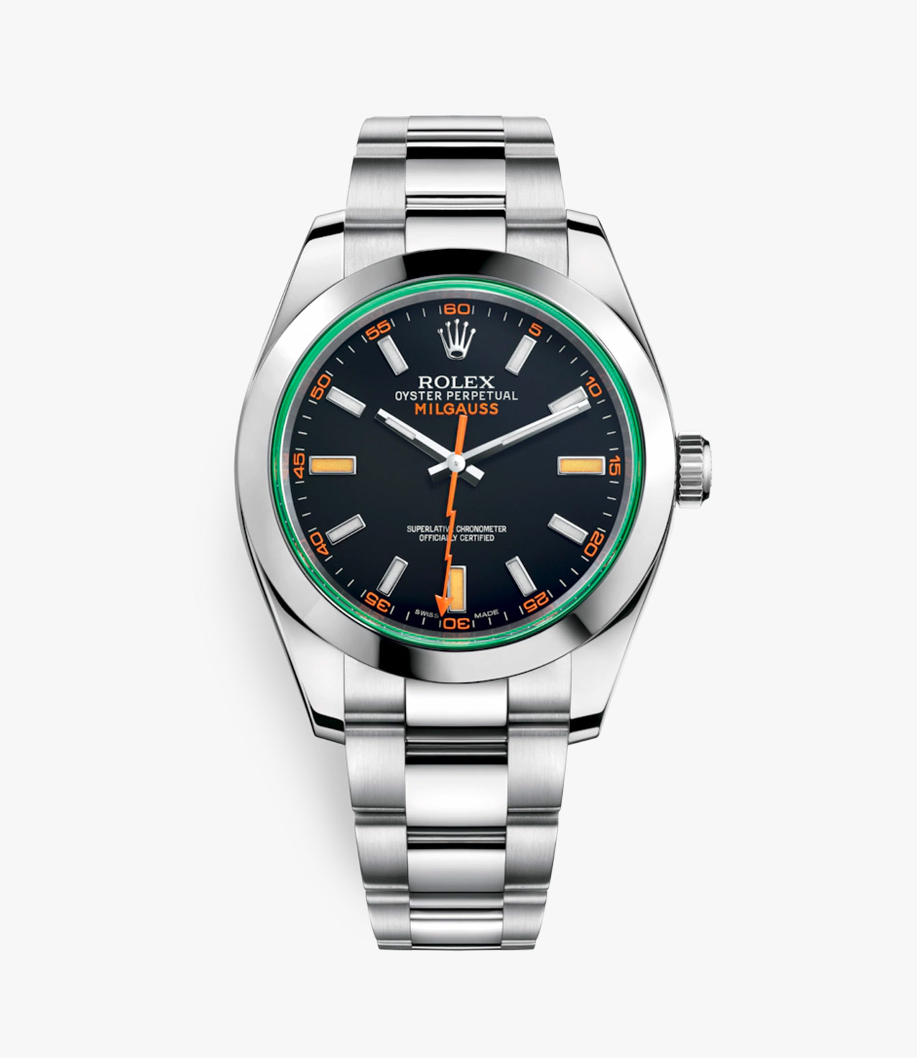 What we like: The Milgauss was originally concieved as a tool for scientists and doctors. Today, it’s one of the boldest, loudedst watches in the Rolex lineup with orange and green accents and a lighting-bolt shaped seconds hand. Fun! And it still boasts superaltive magnetic resistance, too.