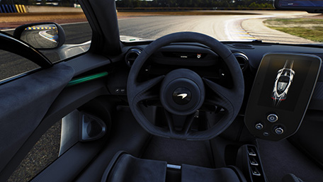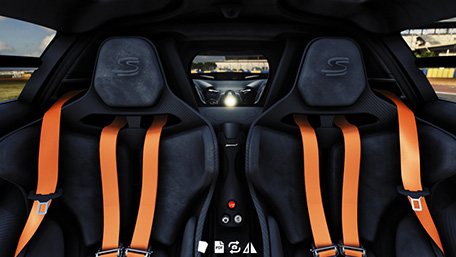 Except for the McLaren Orange three-point seatbelt and six-point harness, I held back on the inside. Even on the giant screen, the cabin appeared so intimate, and there were so many trim pieces available to color, that the aesthetic could quickly veer into Skittles. That meant Carbon Black Alcantara throughout with clear satin carbon fiber accents. Clear Gorilla Glass for door uppers and lowers and the rear bulkhead, and door struts in Amazon Colorstream, would forestall any dungeon sensations. I opted for the Super-Lightweight Carbon Fiber Race Seats, in the Touring size for my American hips. And I splurged on an adjustable passenger seat, because of course. I chose the Owner’s Manual and System Language in U.K. English, because I’m posh. I said yes to every other option, like air conditioning and the seven-speaker Bowers & Wilkins audio, because fantasy configurator money never runs out.
