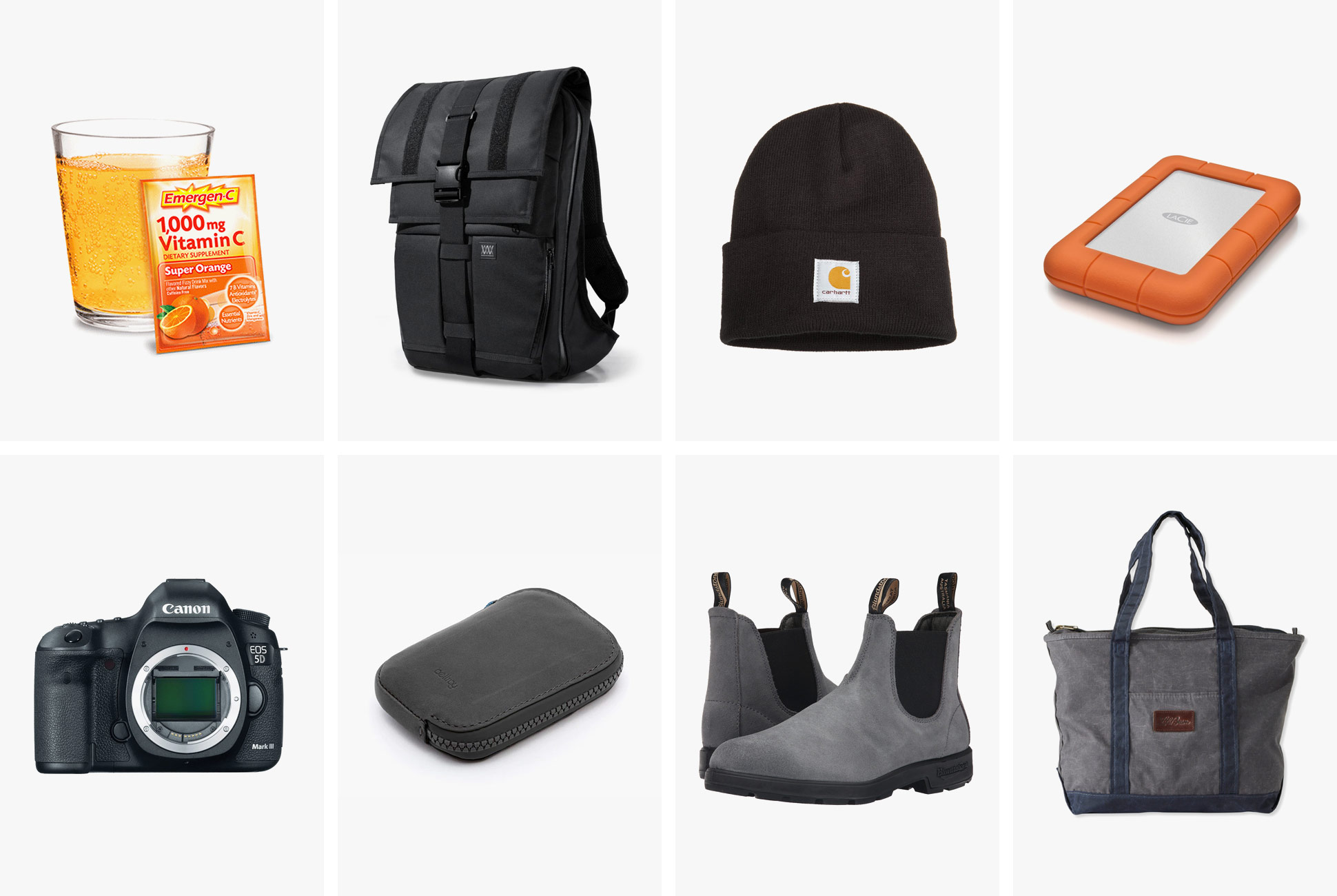 “My packing style revolves around how safely I can travel with my camera. I pack to avoid checking my bag, but have learned to carry a tote in case of emergency equipment storing. My beanie hides my bed head and doubles as an eye mask; the boots are easiest through security. The Emergen-C is my aprés-flight cocktail to give my immune system a prayer through the next two connecting flights.”