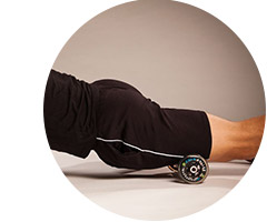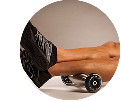 Technique: Sit on a flat surface with both legs outstretched. Supporting yourself on the hands, which should be next to the hip with fingertips out, place one leg on the roller, with the roller just above the ankle. Hold yourself off the ground and roll slowly (one inch per second) up to just below the calf and back down, four times. Set your hips back on the ground and then, with the roller just below the calf, roll your leg slowly from side to side in a spanning motion, also four times. Repeat the cycle on the part of your lower leg from just below the calf to just below the knee. Repeat the cycle with your other leg.