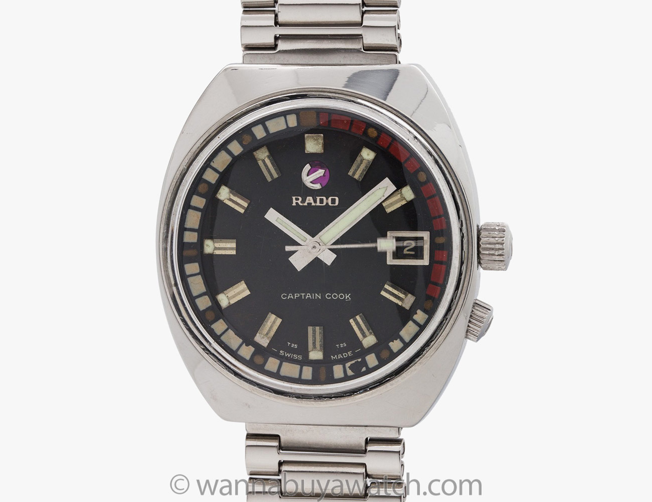 What we like: This Captain Cook is a great example of the cushion-cased, internal-bezeled dive style that became popular in the 1970s. The internal countdown bezel is control via the secondary crown at four o’clock, and the deep red and aged tritium markers pair so well with the inky black dial. This one even comes with its original bracelet.