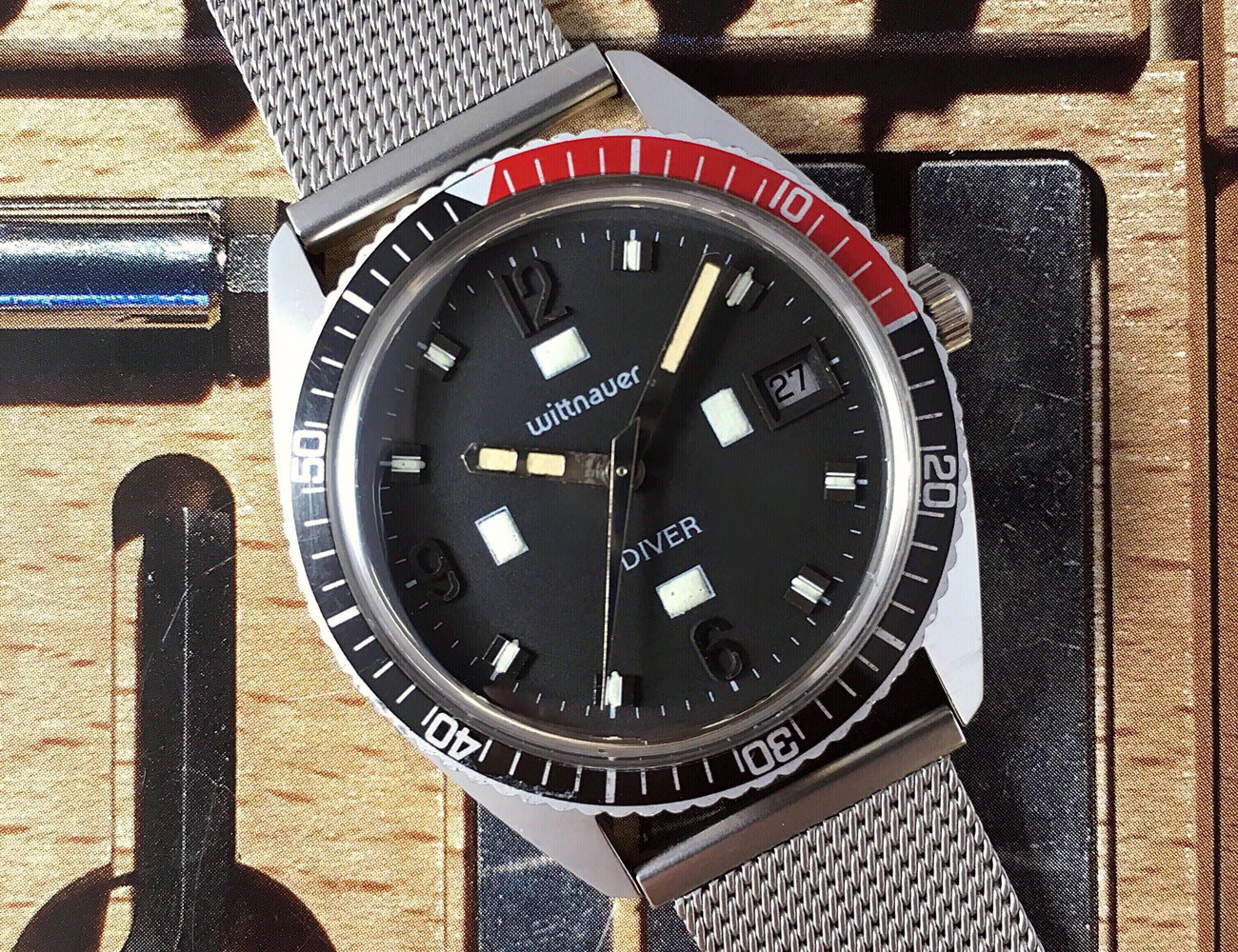 What we like: Wittnauer was an interesting, albeit forgotten watchmaker. It was an American company that dabbled in military and tool watches early in its life, and sourced movements from European makers. The succinctly named Diver here appears to be in great shape and features a 37mm case kept slim thanks to a hand-winding movement from German movement-maker Durowe. The black-and-red “coke” bezel is a stylish touch rarely seen on affordable dive watches like these, as are the blocky lume plots at twelve, three, six and nine o’clock.