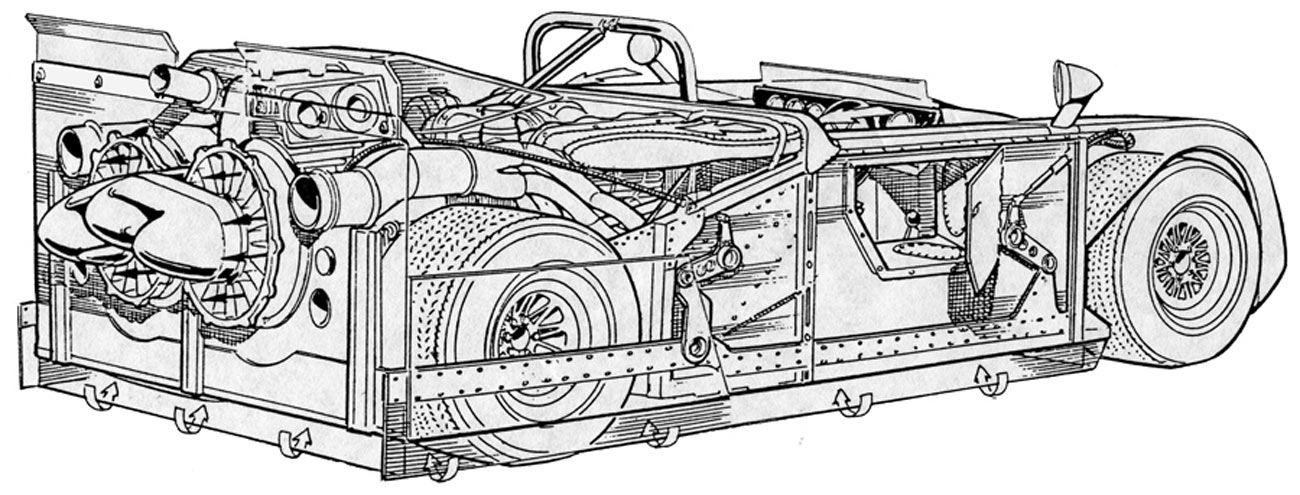 A sketch of the Chaparral “sucker car” with its two fans out back.